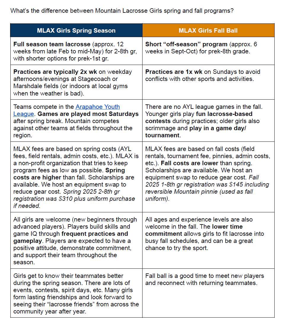Mountain Lacrosse typically offers the following girls' programs during the spring season: