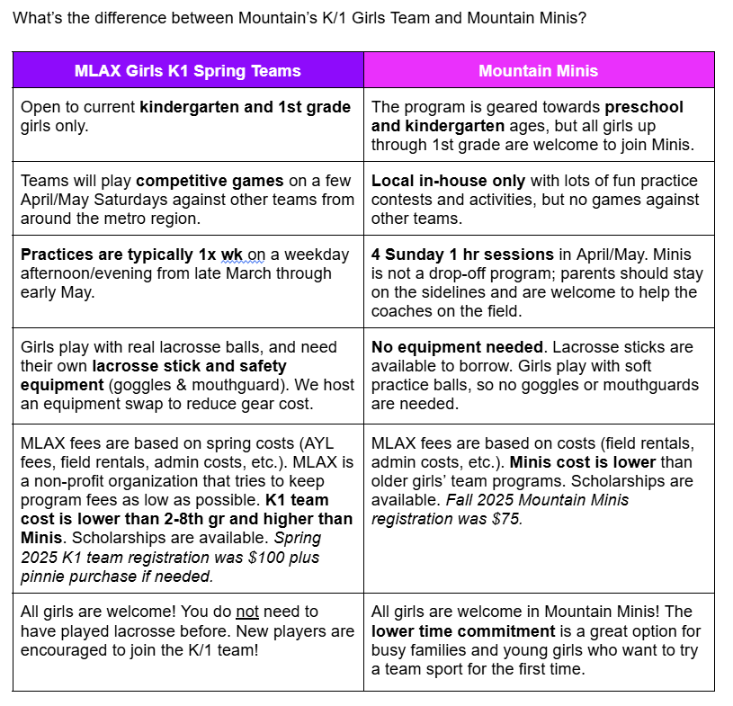 Mountain Lacrosse League (MLAX) Registration Fees: The basic registration fee for 2026 Girls Lacrosse season is $310 and includes fees to the AYL Association, Evergreen Park & Recreation District (EPRD) field fees, referee fees, field lining and maintenance, indoor practice facility rental, team & league equipment (goals, nets, balls, cones, etc.), scholarship fund contribution and more.